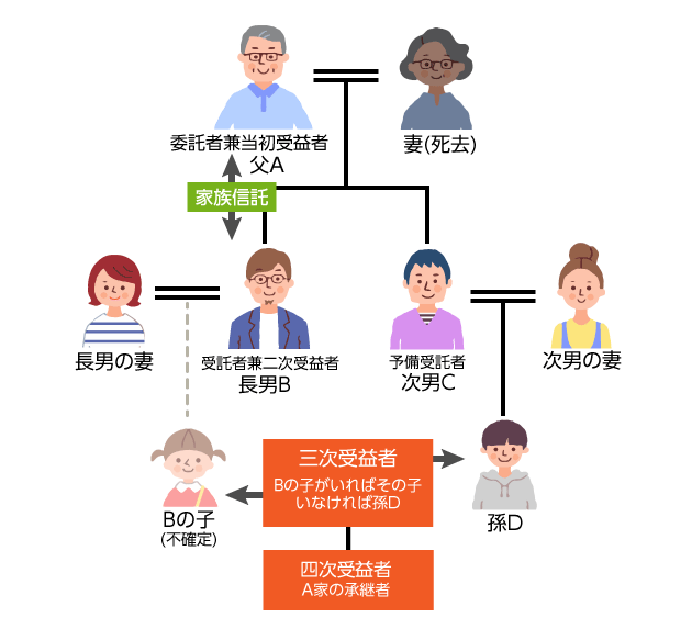 信託が持つ機能により、民法では認められていなかった二次相続以降の資産の承継先を指定できるので、上記のようなケースで、長男Bに子が生まれればBの子に、子が生まれなければDさんなどの孫世代に・・・というような相続を実現することができます。