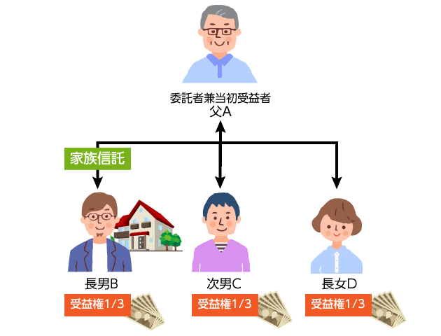 3兄弟が円満なうちに信託契約を交わし、財産管理は最も信頼ができる兄弟1人に託し、他の兄弟は受益者の1人として信託受益権という財産を3人で準共有するという仕組みを作ります。つまり、受益権という財産権は3分の1ずつ平等に保有しますので、収益不動産であった場合、賃料などは3分の1ずつ平等に受け取ることができます。管理処分権限を1人に集約し、管理の手間の合理化、財産管理に関する判断の機動力を向上させるとともに、資産の塩漬け対策を図ることができます。